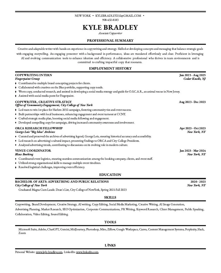 Copywriting, Brand Development, Creative Strategy, AI writing, Copy Editing, Social Media Marketing, Creative Writing, AI Image Generation, Advertising Planning, Market Research, SEO Optimization, Corporate Communications, PR Writing, Keyword Research, Client Management, Public Speaking, Collaboration, Video Editing, Sound Editing